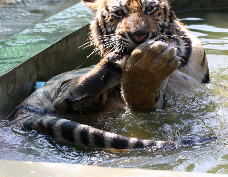 а вот это было делать категорически нельзя - трогать тигра за передние лапы. Обошлось, но служащие меня отругали.