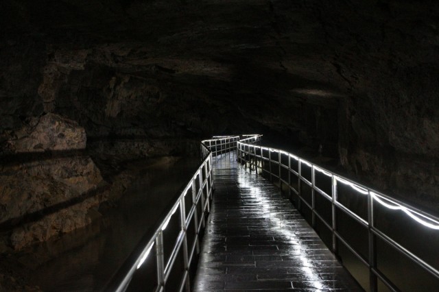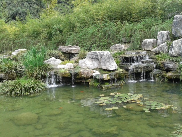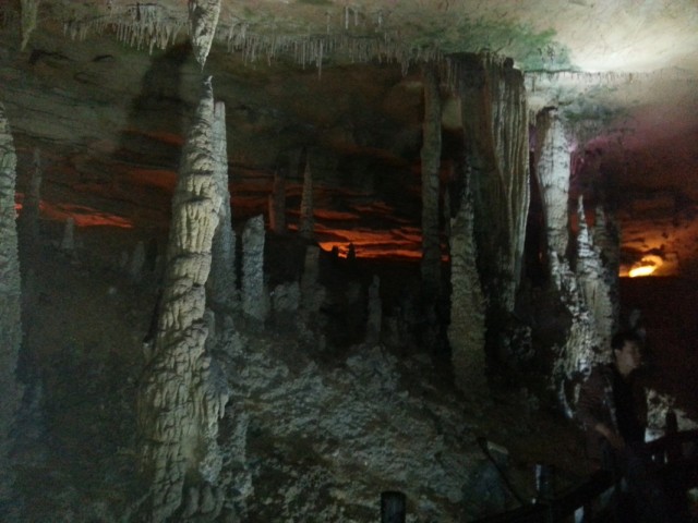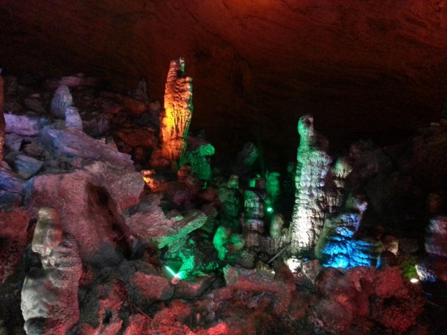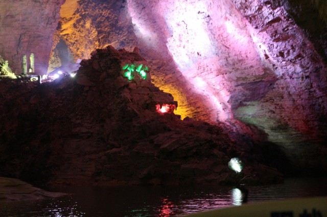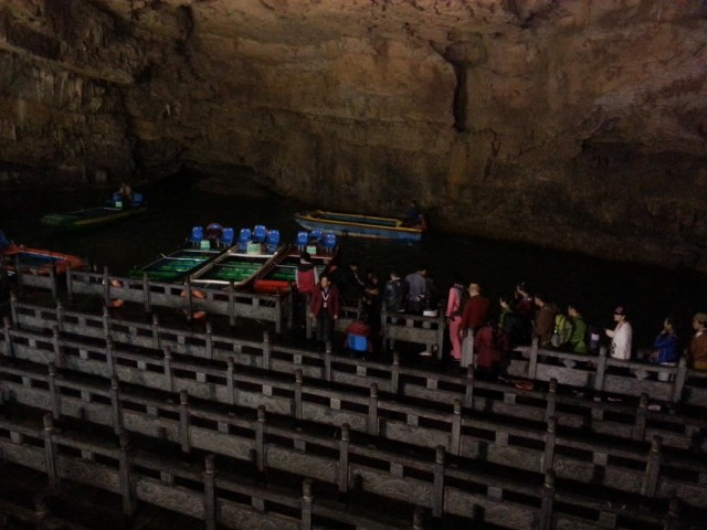 Перед пещерой разбит симпатичный парк - сеть речушек и озер с золотыми рыбками и утками, плакучие ивы, а также большая система водяных колес. Вход в пещеру (точно не помним, вроде около Y150) группами по 60 человек с гидом, экскурсия на китайском длится около двух часов. Первые 10 минут создается ощущение - "Ну сталактиты, ну сталагмиты... пфф, да у нас в Саблино не хуже", а потом начинается! Мало того, что она ОГРОМНАЯ, так там даже река есть, по которой вас прокатят на лодке. И, конечно, сотни ступенек вверх и вниз. На выходе мы встретили ребят. Они отбились от группы и гуляли по пещере сами, а на лодке прокатились аж три раза :)