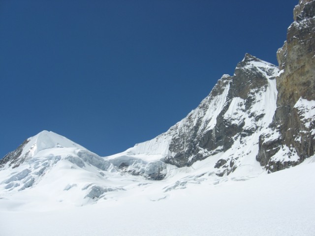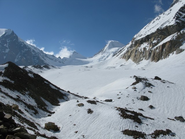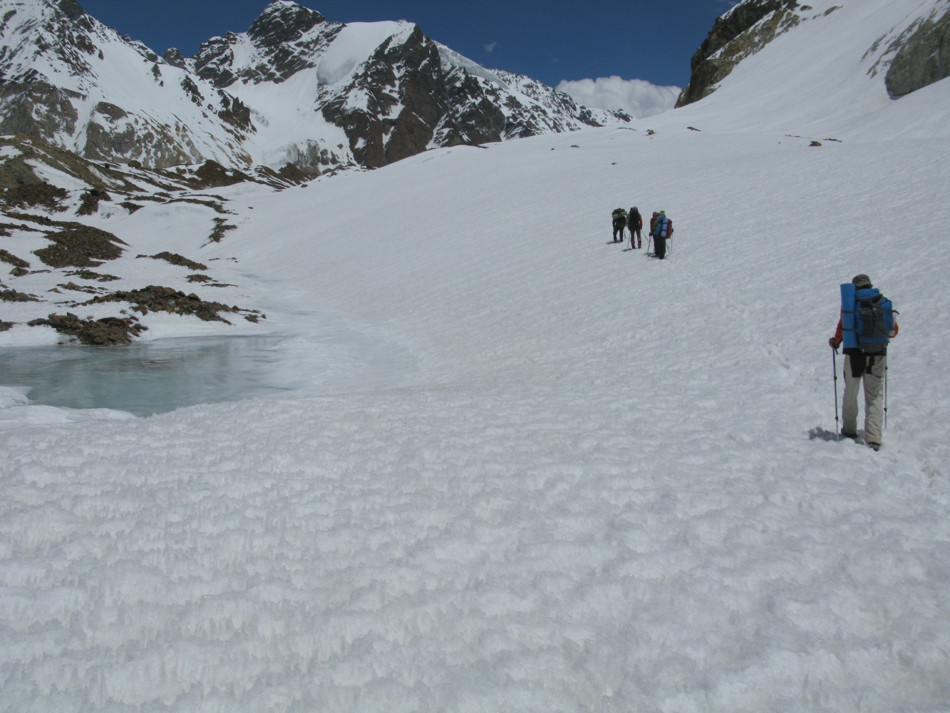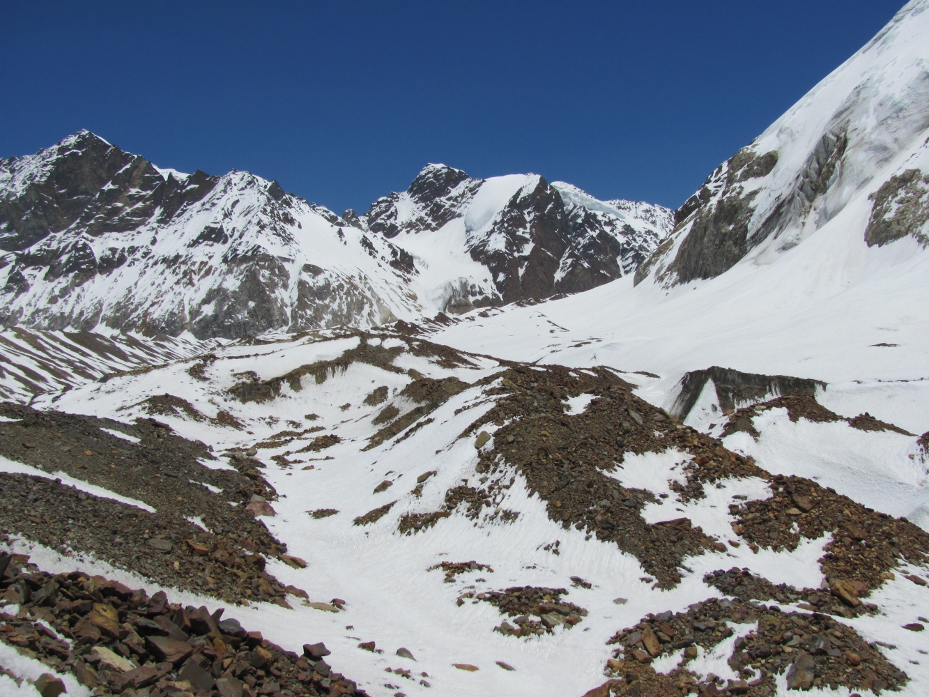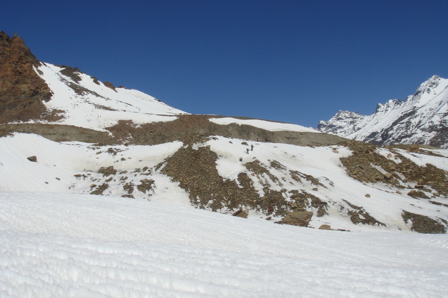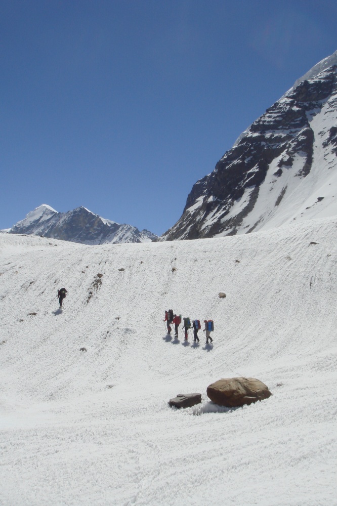 Ребята с гидом сходили на разведку налегке – 1,5 ч до верха. Выход расположен между двумя вершинами — Аваланч Пик (6413м) и Калинди Пик (6102м). Сам проход- в целом ровная снежно-ледовая поверхность с трещинами, площадью примерно в 300 м.. Перевал идется направо.в обход ледовой пирамиды Пика Калинди. После осмотра стало ясно, что портеры не пройдут даже по навешенным перилам. Гид сказал, что заставить их не может и бросить тоже. Очень переживал, что портеры не из его деревни и поэтому такие никакие.