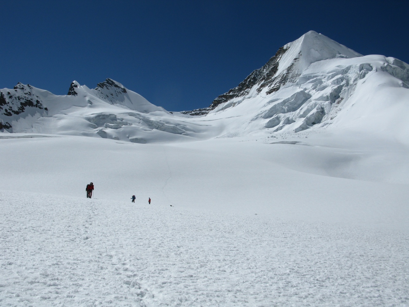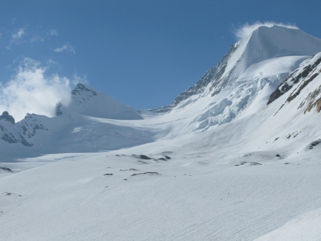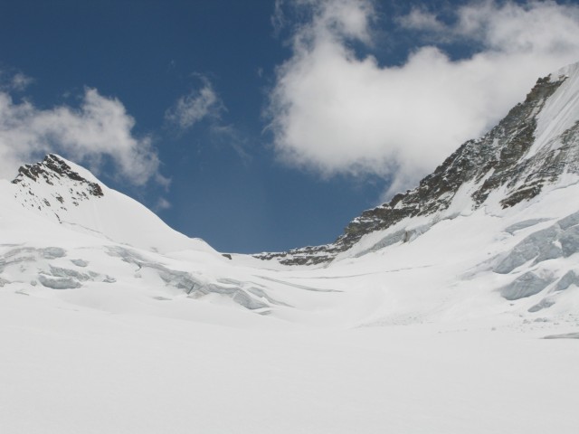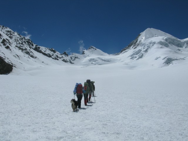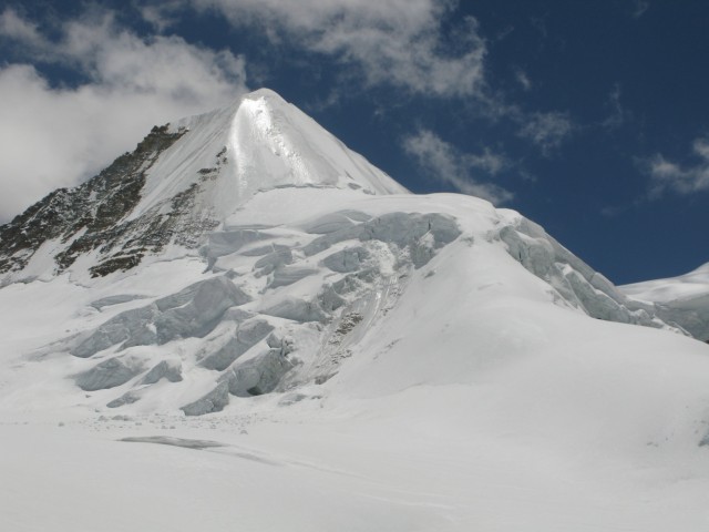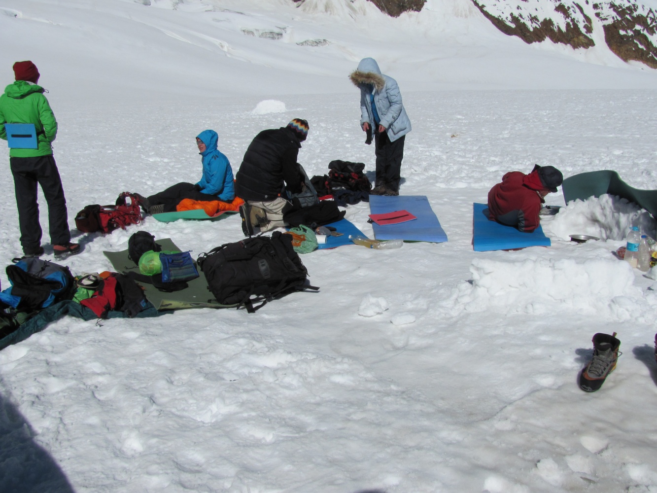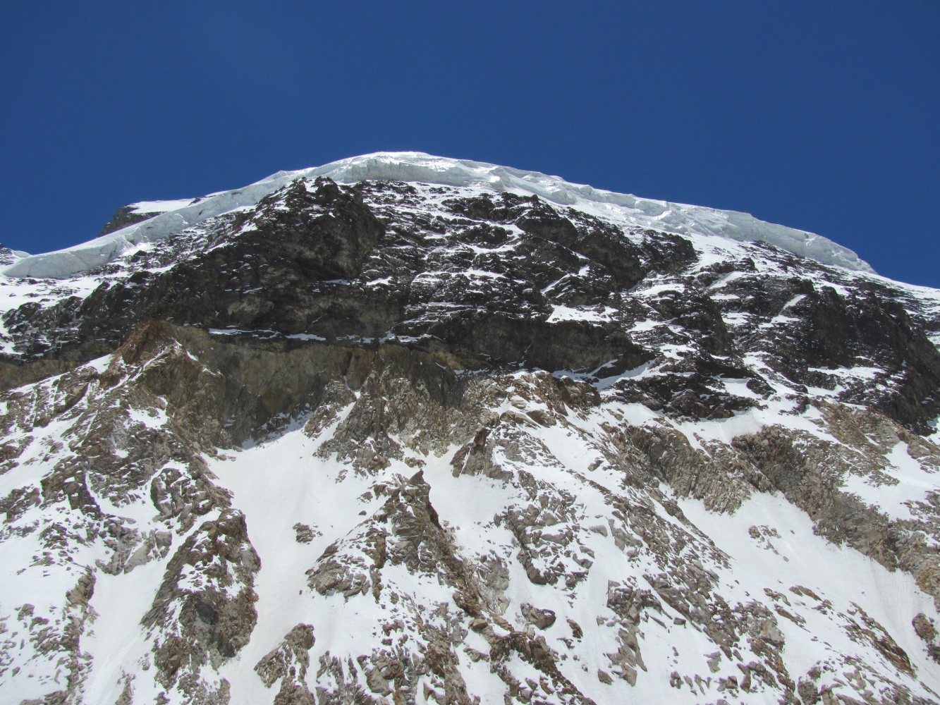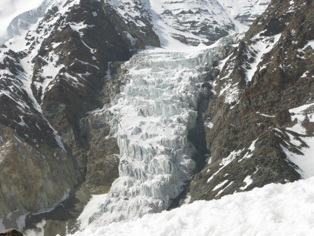 Ребята с гидом сходили на разведку налегке – 1,5 ч до верха. Выход расположен между двумя вершинами — Аваланч Пик (6413м) и Калинди Пик (6102м). Сам проход- в целом ровная снежно-ледовая поверхность с трещинами, площадью примерно в 300 м.. Перевал идется направо.в обход ледовой пирамиды Пика Калинди. После осмотра стало ясно, что портеры не пройдут даже по навешенным перилам. Гид сказал, что заставить их не может и бросить тоже. Очень переживал, что портеры не из его деревни и поэтому такие никакие.