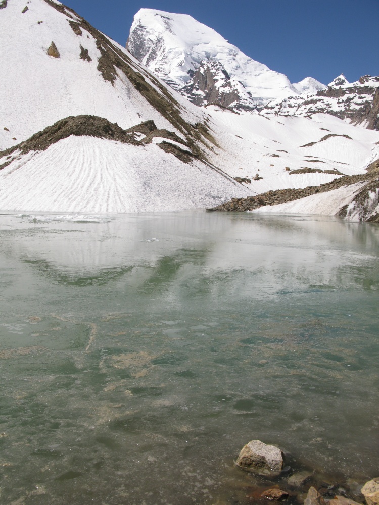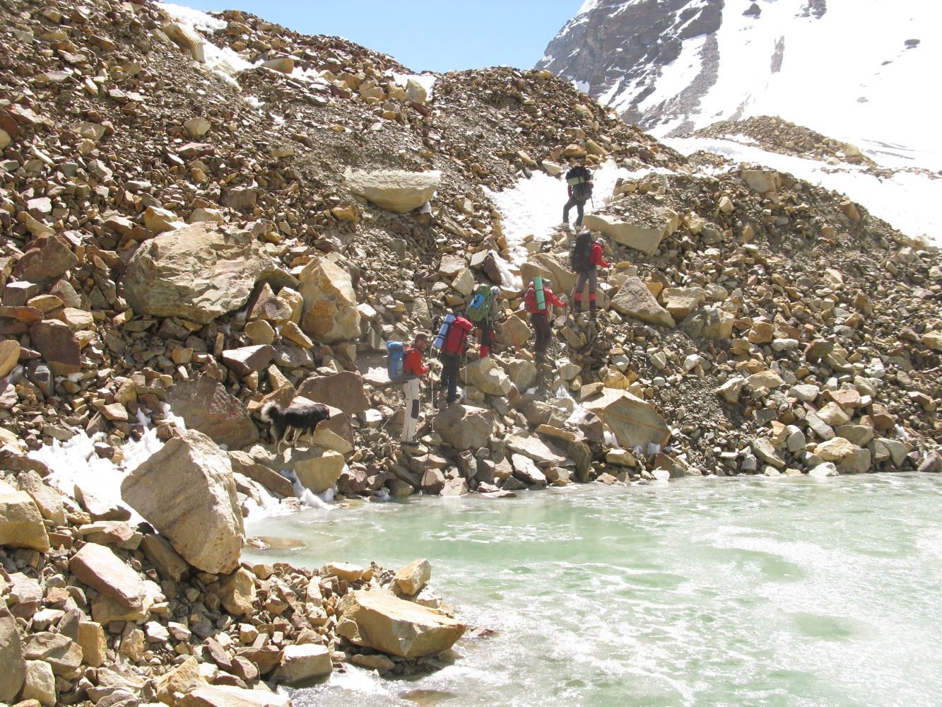 Довольно крутая морена выглядела обманчиво просто, но за счёт высоты переход оказался совсем непростым. Участок ледника в 4 км занял почти 4 часа.