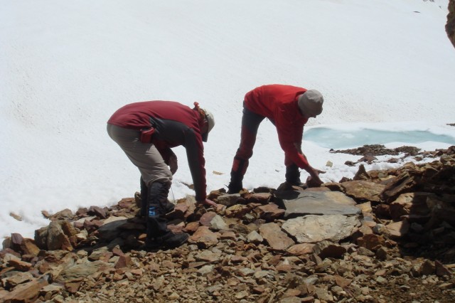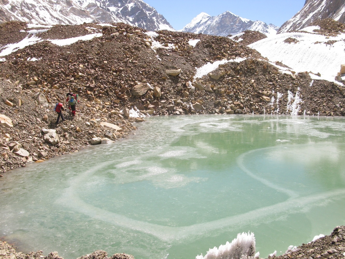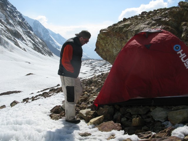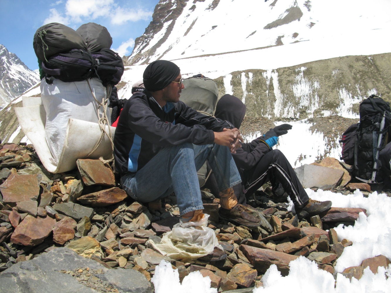 Здесь мы поняли, что у портеров не всё в порядке. Они что-то медленно передвигались. Мы решили в этот день не выходить к базовому лагерю- основанию Калиндикал, а переночевать на каменном островке, всё-таки теплее. Времени было много, поэтому нам удалось расчистить и выложить почти ровную площадку под палатку.