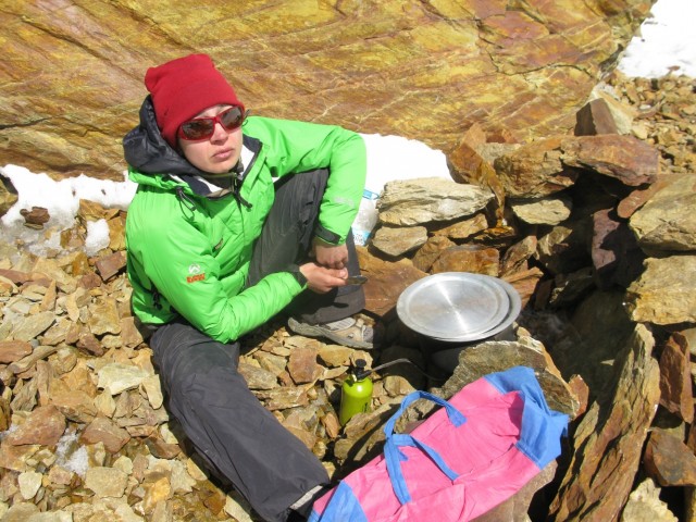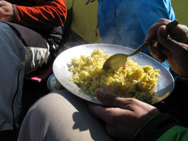 Вечером они позвали нас на ужин- рис с овощами, глядя на который стало понятно, почему у них столько поклажи. Они носят с собой скороварку, две сковородки и такие продукты, которые нам даже в голову бы не пришло брать. Там некоторые портеры пожаловались на плохое самочувствие, мы думали они устали и перегрузились.
