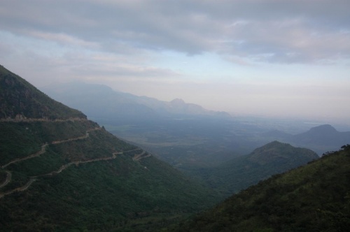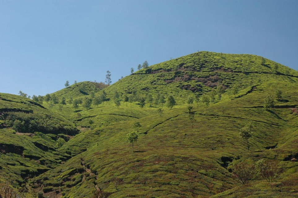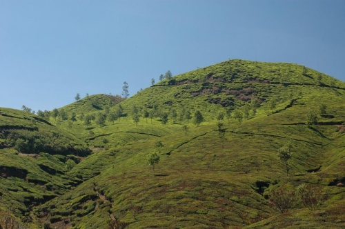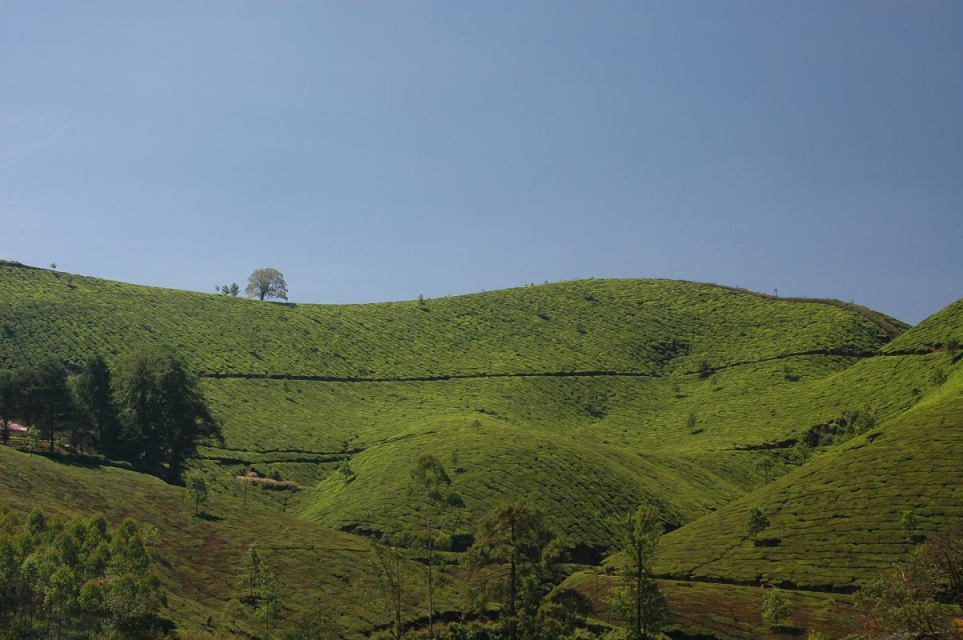 Пока мы ждали наш автобус на станции, к нам подошел индиец и стал интересоваться, куда мы едем. Оказалось, что он сам из Муннара, вез сюда туристов и за символическую плату в 700 рупий на двоих (т.к. деньги с туристов и так уже получил) готов отвезти нас в Муннар. Ориентировочное время в пути - 5часов. «Поломавшись» мы согласились)))))). Это было удачным стечением обстоятельств). В начале пути мы остановились около лотка с фруктами и накупили экзотики: джекфрут и еще какие-то фрукты, не запомнили что. Джекфрут по обещаниям должен был быть «свит». С мелочью расправились на месте, джекфрут последовал с нами в Муннар. До Theni, места где должна была состояться автобусная пересадка на Муннар, доехали быстро. Дальше дорога пошла в горы. Горы были совершенно иные, чем в Кодае. Смотрю фотки, думаю, как описать, какие они? Горы ниже и облака уже над нами, но массивные, все какое-то монументальное, зелени на горах меньше и серпантин соседних гор хорошо просматривается. Он здесь тоже другой. Дороги шире и не так часто поворачивают. Когда ехали по восточному склону уже смеркалось, т.к.солнышко зашло за гору. Границы штатов Тамил Нада и Кералы находятся как раз по вершине хребта Гхат, поэтому как только мы пересекли границу (а вернее шлагбаум) в одно мгновенье оказались в море солнечного света и буйстве растительности. Картинка поменялась разительно. Нас окружали огромные кусты кардамона и деревья, покрытые лианами. Как сказал наш водитель, плантации кардамона, как и чая, являются частной собственностью. Все вокруг было очень зеленым, ветки деревьев закрывали небо. И тут начался чай. Море чая бархатными волнами плыло по холмам! Каждый свободный кусочек земли был засажен кустами. И это море было поистине бескрайним. Мы ехали час, полтора, два, а море чая не кончалось.