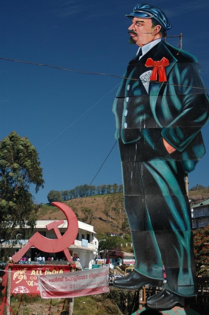 Когда не видишь чайные кусты, что довольно редко, пейзаж уже не тот. Зеленый ковер расслабляет, сразу вспомнился рассказ из детства про зеленую лампа, подаренную Ленину Крупской. Ильич не заставил себя ждать. Меняя направления с Мадупатти на Коймбатор, мы проезжали через цент Муннара. Он был там, большой плакат во весь рост, Ленин с газетой «Правда»!)