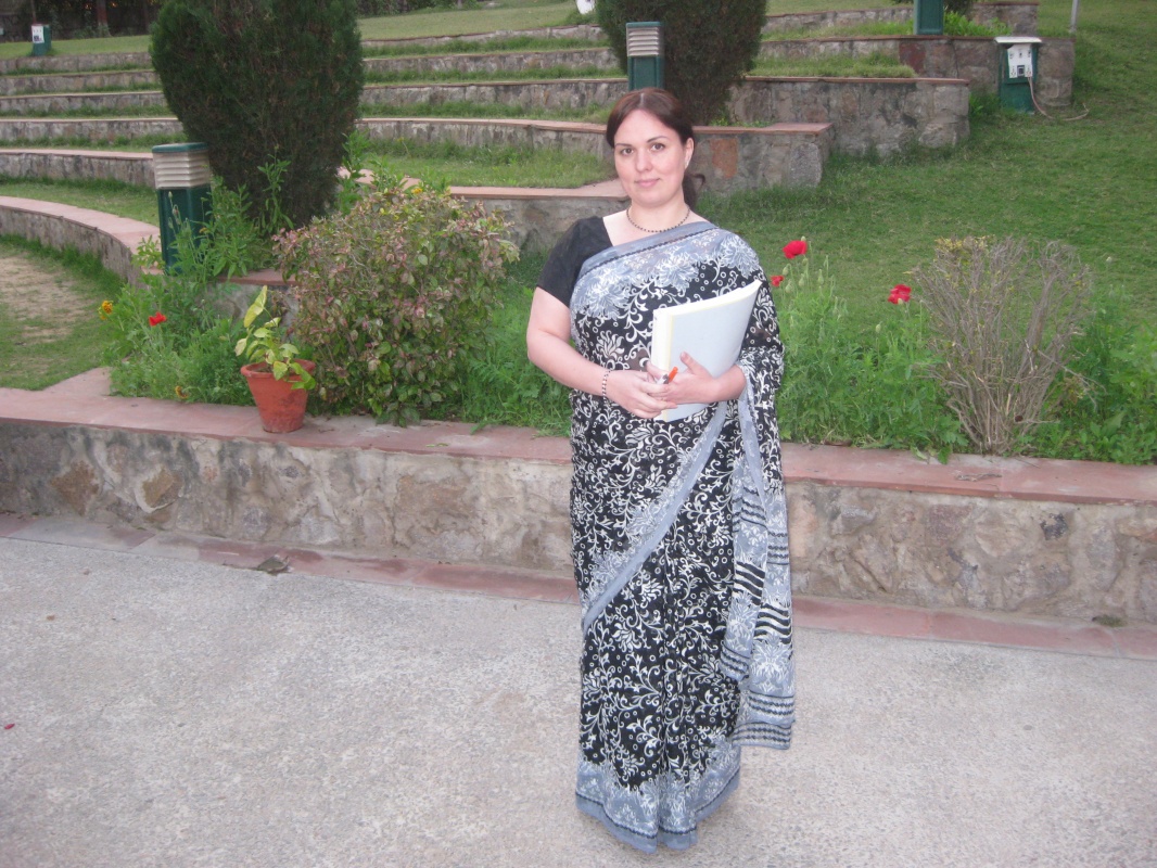 Сари "котпад" - происходит из Корапута, в нем присуствует небеленая набойка из хлопка с мелким точечным рисунком по всему светлому полю. Кайма сари поделена двумя тонкими красными полосами.