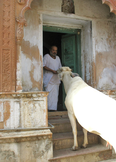 В эти жаркие дни в таких знаменитых вриндаванских храмах как Радха Раман и Банке Бихари совершается особая пуджа. Божество устанавливают перед сооружением, напоминающим беседку, увитую от и до жасминовыми гирляндами. Храмы наполняются жасминовым ароматом. Выглядит очень эффектно. Ведь жасмин охлаждает, что в жару - самое то. Лето во Вриндаване - время особенных игр Кришны. Если зимой, в холод, Радха и Кришна прячутся в дуплах деревьев, то летом они качаются на качелях, увитых цветами. И все эти разные настроения времен года отражаются на Вриндаване - в его храмах, на улицах, среди людей. Конечно, это по своему происходит в каждой стране, но во Вриндаване все непостижимым образом связано с Кришной и его Играми. В этом чувствуется особая вриндаванская «раса», то есть, с санскрита, - вкус. Или мы бы сказали – атмосфера.