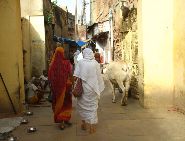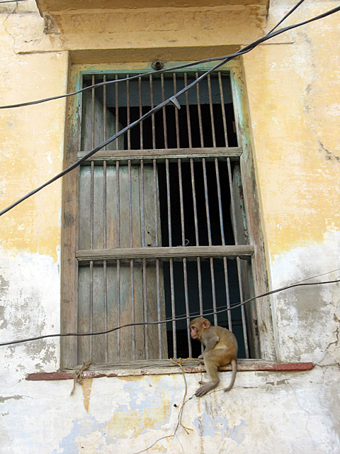 На следующее утро вышли в 6. О, это непередаваемое ощущение утреннего Вриндавана летом! Свет ярок, но пока еще не выжигает цвет. В этой милой утренней прохладе уже угадывается будущий полуденый зной, но пока, пока... Людей еще немного, большинство лавок закрыто, лишь чай-валы уже на свом посту. У дешевого сабджи-базара дежурят мартышки в надежде урвать что-нибудь для завтрака. Я стараюсь не ходить с краю улицы, под карнизами домов, где тусуются макаки, - справить нужду на голову какому-нибудь недотепе для этих маленьких вриндаванских засранцев - самый шик. Большелапые хвостатые детеныши качаются на проводах, как на лианах в лесу. Приспособились, однако.