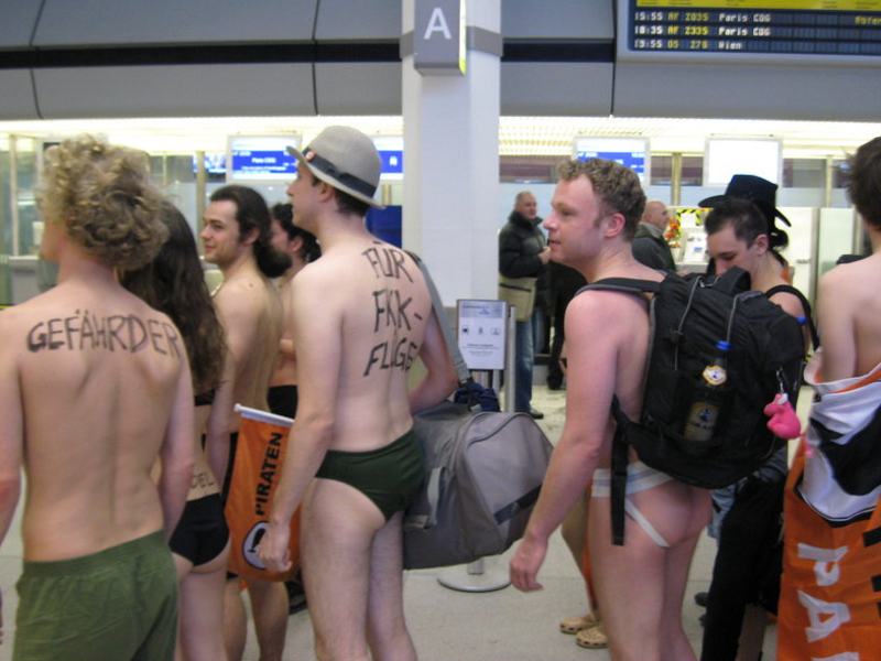 В знак протеста против установки в немецких аэропортах так называемых "раздевающих сканеров", которые позволяют увидеть человека без одежды, члены Пиратской партии Германии провели голые флеш-мобы.