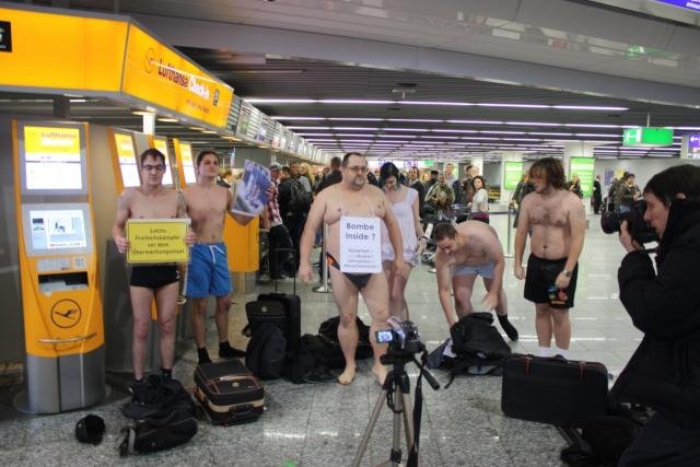 Акции под лозунгом "Вам не нужно нас сканировать - мы и так голые" прошли в берлинском "Тегеле" и в аэропортах Франкфурта-на-Майне и Дюссельдорфа.