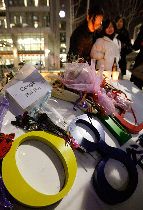 Около офиса американской компании Google Inc некоторые китайцы устроили прощание с Интернет-гигантом. Надо сказать, что не все пользователи Интернета в восторге от происходящего. В этой поисковой системе иногда проходили материалы, которые не были затронуты цензурой.