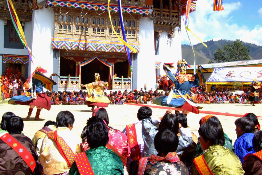Впервые священные танцы с масками мистерии Чам были поставлены индийским святым Падмасамбхавой, принесшим в 8 веке буддизм в Бутан и Тибет. Позднее они переосмыслены и усовершенствованы Пемой Лингпой, и в этом виде дошли до наших дней. Танцы повествуют о подвигах неземных героев и героинь, о покорении злых духов, дают жизнеописания буддийских святых. Бутанцы верят, что простое созерцание этих танцев способствует духовному освобождению. Танцоры одеты в костюмы из шелка и парчи и в разноцветные маски, изображающие мудрецов, божеств-защитников, героев легенд и просто животных. Звуки цимбал, барабанов, горнов и колокольчиков сопровождают это хореографическое и медитативное действо.