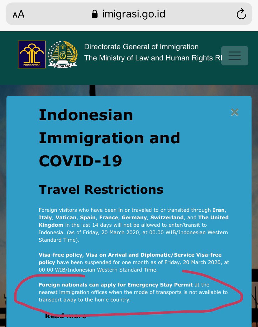На сайте ‹тыц› есть информация, что туристам, которые не могут покинуть Индонезию, будет выдано разрешение на пребывание Emergency Stay Permit.