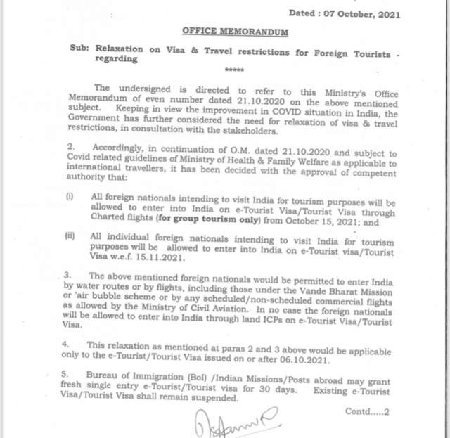 Министерство внутренних дел Индии объявило, что начнет выдавать новые туристические визы иностранцам, прибывающим в Индию чартерными рейсами - с 15 октября. И прилетающим другими типами рейсов с 15 ноября 2021 года!