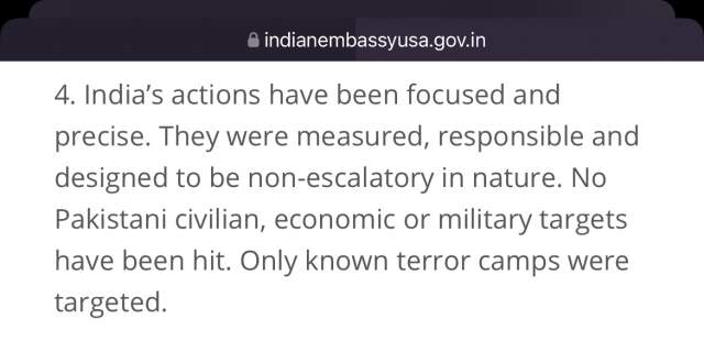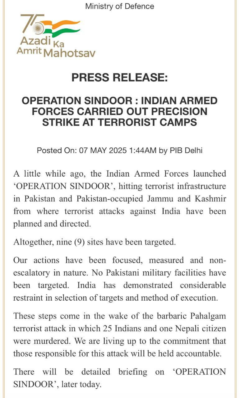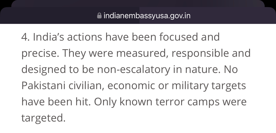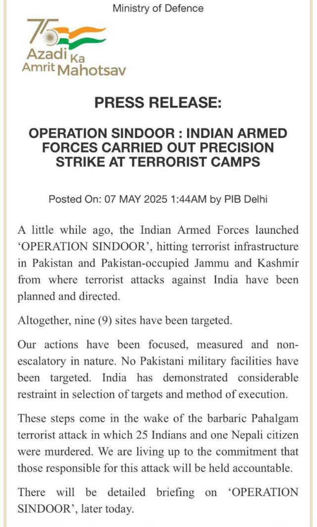 6 мая Индия провела ракетные удары по девяти объектам на территории Пакистана, включая районы Котли, Музаффарабад и Бахавалпур, в рамках операции «Синдур», направленной против террористической инфраструктуры. Пакистан заявил о гибели по меньшей мере трёх мирных жителей, включая ребёнка, и пообещал «решительный» ответ, назвав действия Индии «актом войны».