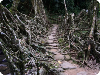 Пока на Западе архитекторы и учёные разрабатывают технологии экологического строительства, а также концепции выращивания «живых зданий», подобные идеи уже довольно давно эксплуатируются в менее развитых странах Востока, где природа и климат весьма способствуют этому. В индийском штате Мегхалая, что на востоке Индии, местная народность кхаси уже многие годы занимается выращиванием живых мостов, которые с каждым годом становятся всё прочнее и сами себя «ремонтируют».Технология строительства живого моста не особенно сложна, однако «выращивание» моста занимает довольно длительный срок. Желая построить очередной мост через овраг или речку в джунглях, «строители» находят подходящие виды каучуковых деревьев и начинают направлять их корни, соединяя их со стволами бетелевой пальмы. После того, как корни «схватят» ствол, они начинают расти вдоль него, соединяются между собой, образуя прочные связи.