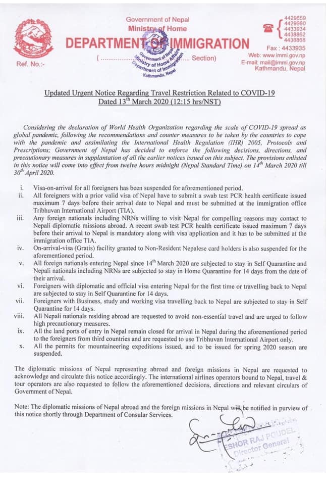 18 марта 2020 года на заседании, посвященному противодействию распространению вирусной инфекции COVID-19 Премьер Министр Непала и Министр по безопасности решили:
