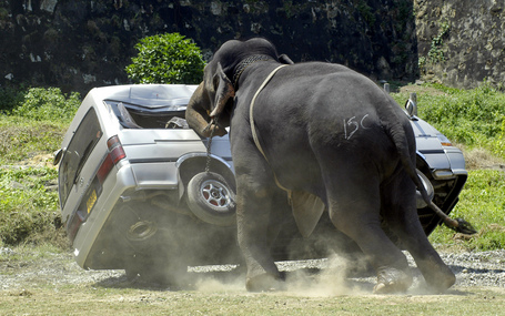 Во время очередного турнира по поло с участием слонов, одно из животных неожиданно запаниковало и атаковало микроавтобус.